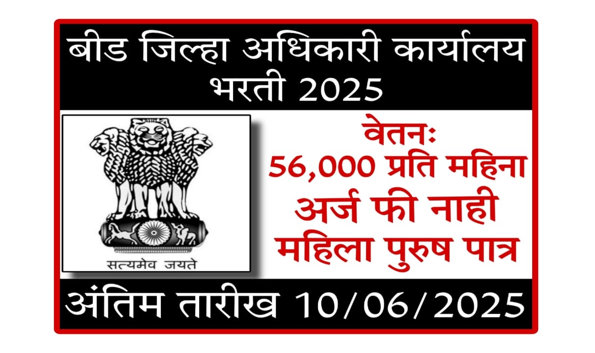 Collector Office Bharti 2025 जर तुम्ही सरकारी नोकरी महाराष्ट्र मध्ये शोधत असाल, तर तुमच्यासाठी जिल्हा अधिकारी कार्यालय भरती 2025 ची उत्तम संधी उपलब्ध झाली आहे. जिल्हाधिकारी कार्यालय बीड द्वारे कलेक्टर ऑफिस बीड जॉब साठी नवीन व्ॅकन्सी जाहीर करण्यात आली आहे. या नोकरीमध्ये तुम्हाला 56,000 रुपये महिना वेतन मिळणार असून, विविध फायदेही मिळतील.